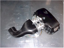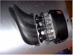 The introduction of the carbon plenum systems bring the science of induction technology to another level. Not only is the carbon pleasing to the eye, but allows for a reduction in heat transferrence from the engine to the induction charge and thereby increases performance. The twin throttle bodies on the plenum shown below offer a further improvement in throttle response and the increased overall size of the throttle body results in more available air for the engine. ACT Performance Products is responsible for the design and much development has been centred on the increased airflow and improvements in the flow characteristics of the air. These developments culminated in the tripple throttle body with increased volume in the collector (shown below,right). These Plenums are designed to fit on the standard TVR Griffith and Chimaera and therefore incorporate a collector which accepts the Lucas Airflow Meter.